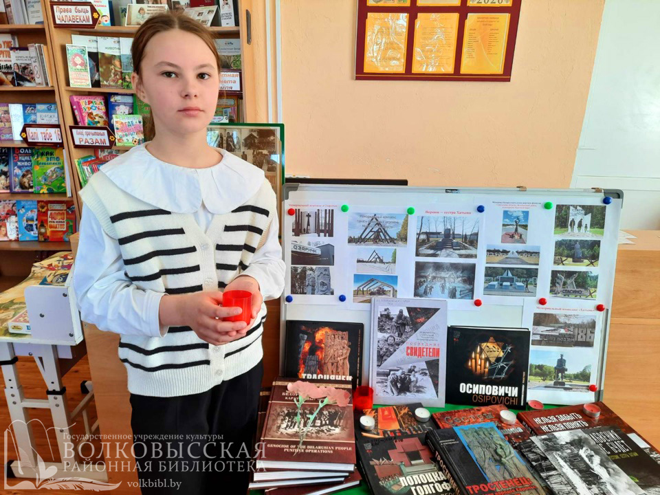 С целью формирования у учащихся представления о геноциде белорусского народа, воспитания уважительного отношения к историческому прошлому страны, раскрытия особенностей карательных операций на территории Беларуси и их последствий, уважения к памяти о жертвах войны 2 апреля библиотекарем филиала «Городская детская библиотека» Губаевой М.Р. для учащихся 5 «Б» класса СШ №4 г.Волковыска было проведено мероприятие «Горит памяти свеча» в форме исторического экскурса.