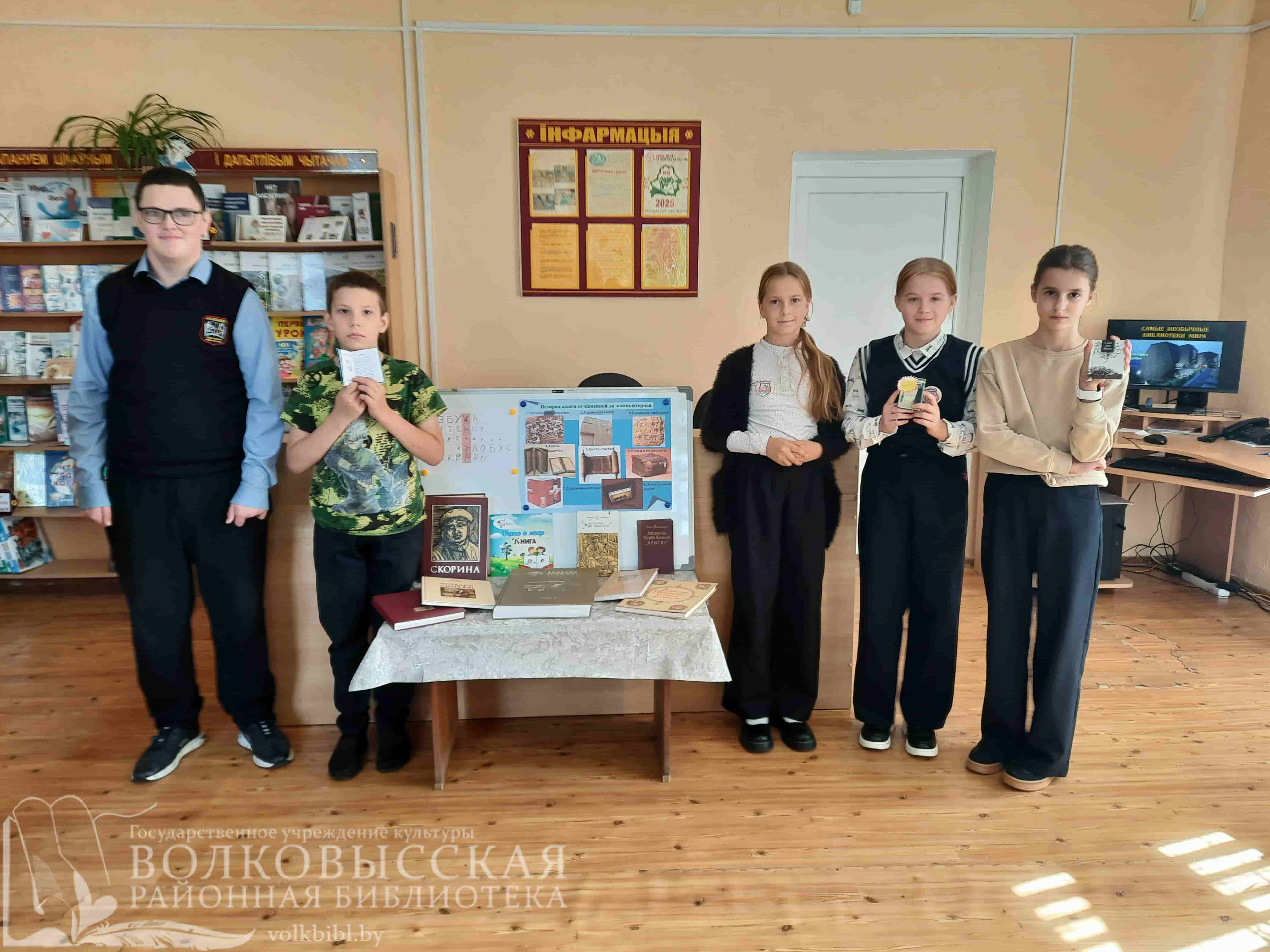 В начале мероприятия школьники вспомнили, что такое «информация», какую роль она играет в жизни человека. С помощью презентации «История возникновения книги» проследили весь путь книги – от сказителей, узелкового письма, глиняных табличек, пергамента до современных изданий в компьютерном исполнении. Вспомнили белорусского первопечатника Франциска Скорину. Школьники рассказали о современных цифровых информационных носителях. Библиотекарь Еремеева М.И. познакомила ребят с «необычными» книгами филиала и продемонстрировала самую старую, самую маленькую и самую большую книгу библиотеки.