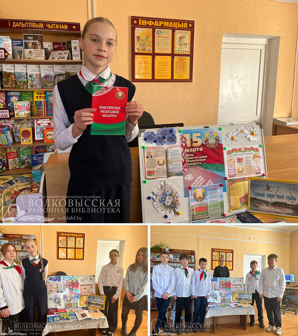 Библиотекарь Губаева М.Р. рассказала, что такое Конституция и почему её называют Основным Законом, познакомила с историей создания Конституции Республики Беларусь, её структурой, основными разделами и статьями, правами и обязанностями граждан Республики Беларусь.